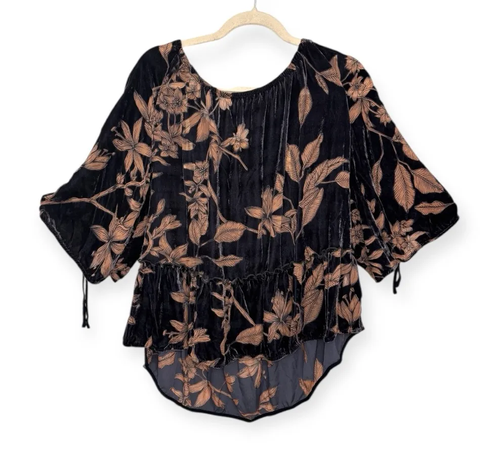 Beautifully soft and romantic burnout velvet blouse by Democracy, featuring a dark floral pattern in black and bronze-brown tones. This top has a boho peasant silhouette with a scoop neckline, flowy elbow-length sleeves with drawstring detail, and a slightly ruffled hem for a flattering drape. The luxe velvet burnout texture and moody floral print give it a whimsy goth edge while maintaining a bohemian, free-spirited vibe — perfect for pairing with jeans, maxi skirts, or layering under a leather jacket. About the brand: Democracy is a modern boho-inspired brand known for its “fit and flatter” silhouettes and easy, wearable designs. Sold at Nordstrom Rack, Dillard’s, and Macy’s, Democracy pieces blend comfort with elevated bohemian style. Details: • Brand: Democracy • Size: Large • Color: Black with bronze-brown floral burnout pattern • Material: 70% Rayon, 30% Nylon • Pit to pit: 19” • Length: 29” • Condition: Pre-owned, excellent condition • Style: Boho goth blouse, burnout velvet top, whimsy goth romantic blouse Keywords: whimsy goth, boho top, burnout velvet blouse, dark floral top, romantic blouse, moody boho, witchy style, fall fashion, Anthropologie style Ships from a smoke-free, pet-friendly home.
