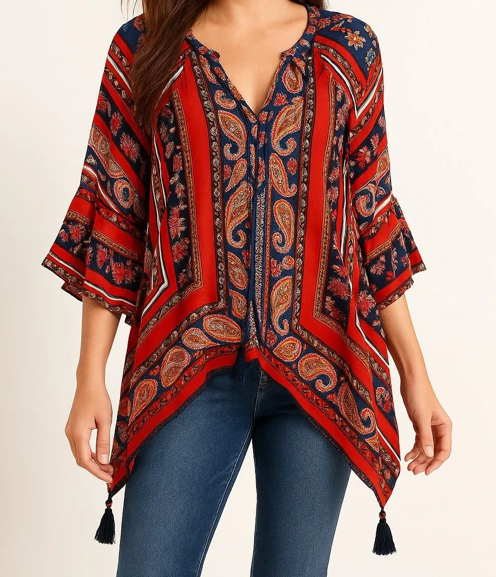 V-neckline with snap closure, embroidery, and three-quarter bell sleeves. Asymmetrical hemline with decorative tassels. Intricate border print and paisley motifs throughout. * Condition: Great pre-loved condition, no holes, stains, or tears- see photos for details * Size: Large * Color: Multi, red, blue, orange, white * Approx. Flat Measurements: P2P- 21" , Length- 26" Digital model photo may be used for styling purposes only. Keywords: paisley, tassel, boho, print, red, blue, vneck, asymmetrical, lightweight, coverup, blouse, top