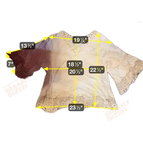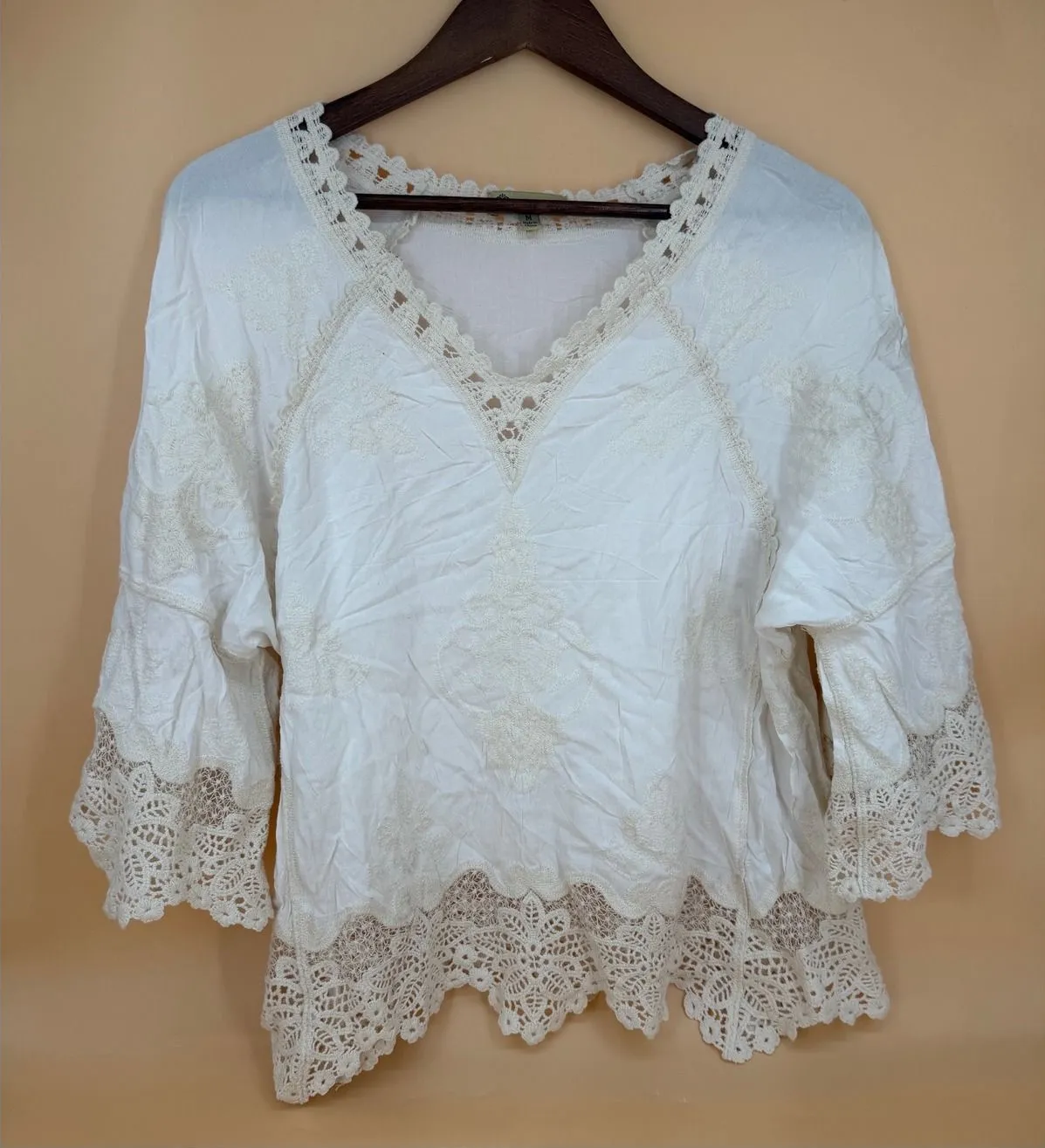 A white embroidered peasant blouse with intricate crochet lace details. This charming top features a flattering V-neckline with delicate lace trim, flowing into 3/4 length bell sleeves that also boast wide lace cuffs. The bodice is adorned with subtle, tonal embroidery, and a scalloped lace hemline adds a romantic finish. Perfect for a beach vacation, a casual weekend brunch, or a music festival. Type: Blouse Department: Women Style: Tunic Neckline: V-Neck Sleeve Length: 3/4 Sleeve Sleeve Type: Bell Sleeve Pattern: Solid Accents: Embroidered, Crochet Theme: Hippie, Bohemian Features: Lightweight, Crochet Fit: Relaxed Fabric Type: Crochet Occasion: Casual Closure: Pullover Season: Spring, Summer, Fall Keywords: bohemian, peasant blouse, crochet, lace, embroidered, bell sleeve, scalloped hem, romantic, feminine, lightweight, resort wear, vacation, festival, casual