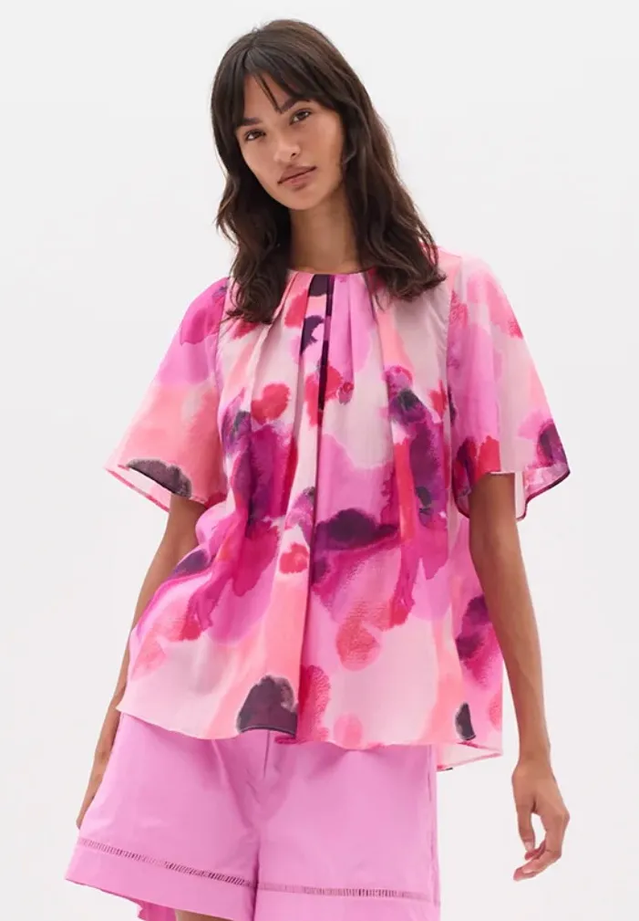 Size 12 InWear Freyah Top Painterly Print A-Line Blouse. The Freyah Top by InWear brings effortless elegance to your wardrobe with its soft, painterly print in blush pink tones. Crafted from a lightweight cotton-viscose blend, this InWear top is breathable and beautifully draped perfect for warmer weather or stylish layering. Featuring a round neckline with pleat details, short sleeves, and a relaxed A-line silhouette, this feminine blouse offers a flattering fit with an airy, comfortable feel. Whether tucked into high-rise trousers or worn loose with denim, it’s a versatile piece you’ll reach for again and again. Detail: Pleat details Round neckline Short sleeves A-line silhouette Flowy, lightweight, and breathable cotton blend Fit: Loose, airy fit True to size Materials: 60% Cotton, 40% Viscose Wash inside out with similar colours Hang to dry