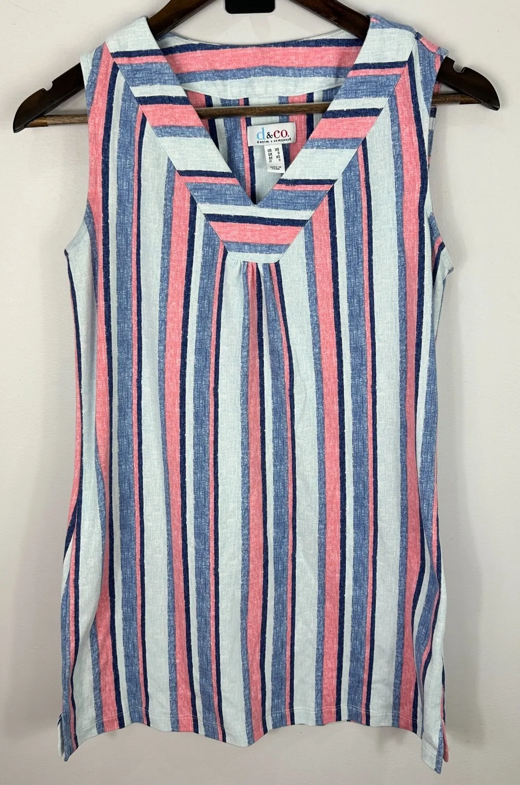 Denim & Co Sleeveless Tunic Top Womens XS Multicolor Striped Coastal Preppy Summer Stylish and versatile Denim & Co. sleeveless tunic top in a breezy multicolor stripe pattern. Features a flattering split V-neckline with front pleat detail, side slits for ease of movement, and a relaxed fit perfect for warm weather wear. This piece embodies coastal and preppy style, making it ideal for casual outings, beach vacations, or layering under a cardigan for transitional seasons. Features: * Brand: Denim & Co. * Size: XS (US) / S (UK & IT) / XS (DE) * Color: Multicolor (blue, coral, white) stripes * Sleeveless with split V-neckline * Front pleat detail * Side slits for comfort * Coastal, preppy, summer aesthetic * Material: Lightweight woven blend (exact content tag not visible) Condition: Excellent pre-owned condition with no visible flaws. coastal, preppy, summer, beachy, vacation, casual chic, weekend wear, classic stripe, resort wear, nautical #CoastalStyle #PreppyWardrobe #StripedTop #SummerOutfit #ResortWear