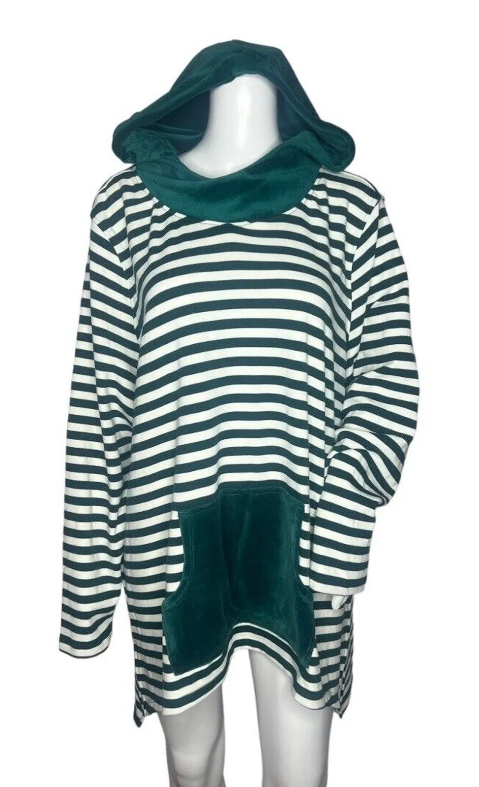 Denim & Co Velour Hood Stripe Tunic Kangaroo Pocket Green White Coastal Cabin Women's Size 2X Denim and Company, d&co, striped hoodie, velour trim, velvet accents, longline tunic, oversized fit, dark green, forest green, hunter green, nautical, maritime, preppy, grandmacore, coastal grandmother, cottagecore, lounge wear, cozy core, athleisure, travel outfit, winter layering, fall fashion, comfort chic, soft girl, modest fashion, cabin life, outdoorsy, classic style, knit top, qvc fashion Measurements are Approximate: Length 28" to 31" Armpit to Armpit 26" Pre-owned in excellent condition unless otherwise stated. Please see photos for condition, measurements and details. Please Verify Measurements. (2095)