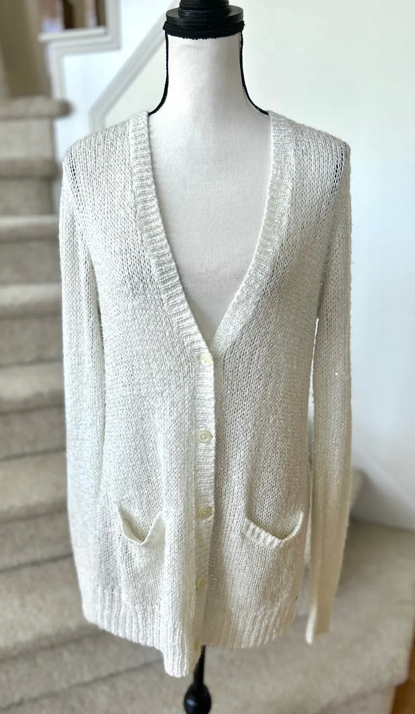 Good condition, there is a repaired snag on the back--you can see the line. White loose knit, all over sequins that sparkle, long sleeve v-neck with front pockets. Buttons up front. Size Medium pit to pit 20 inches shoulder to hem 29 inches acrylic/polyester