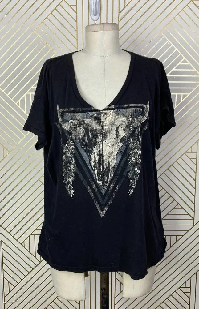 Ralph Lauren Denim & Supply Cow Skull Feather T-Shirt in Black. Pullover Short sleeve Triangle with cow and feather print Deep v-neck Size US Medium 100% Cotton Machine wash warm Armpit to armpit is approx 25" Length is approx 24"