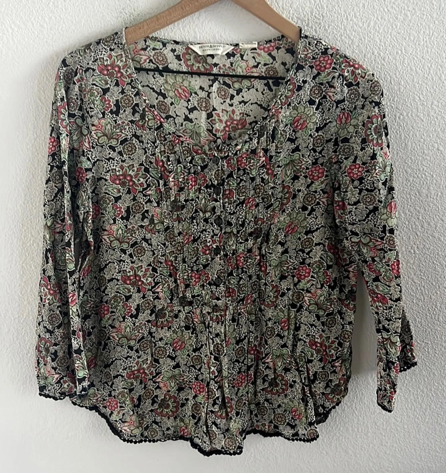 Ralph Lauren Denim & Supply Dark Floral Lightweight 100% Cotton Lace Trim. Upper front bottom, light pleading. Preowned. Size: Medium Underarm-to-underarm: 19" Length: 24" Measurements are approximate and taken flat. 100% Cotton ITEM 0677 dark floral, boho, black trim, boho, lagenlook, mature, discontinued, casual, floral, artsy, art to wear