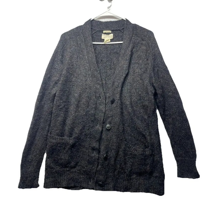 This Ralph Lauren Denim & Supply Women's Gray Cardigan in size medium is made from Italian yarn, featuring a solid gray color with a tight-knit design. The cardigan has a classic fit, long sleeves, a V-neckline, and button accents. Suitable for various occasions such as travel, parties, or casual wear, this oversized, lightweight sweater is perfect for the winter, fall, and spring seasons. Made with a blend of nylon, mohair, viscose, wool, and acrylic, this cardigan also includes pockets for added convenience.