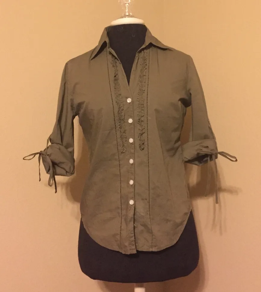 This Button Front Blouse is in great condition. It has ties to roll yo the sleeves and ruffles down... Show more