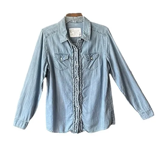 Denim Chambray button up ruffle front shirt. Button two pockets. Button cuffs. Shirt tail hem. 100% cotton. Size medium. Length 27”. Pit to pit approx. 20” flat lay. Great condition.