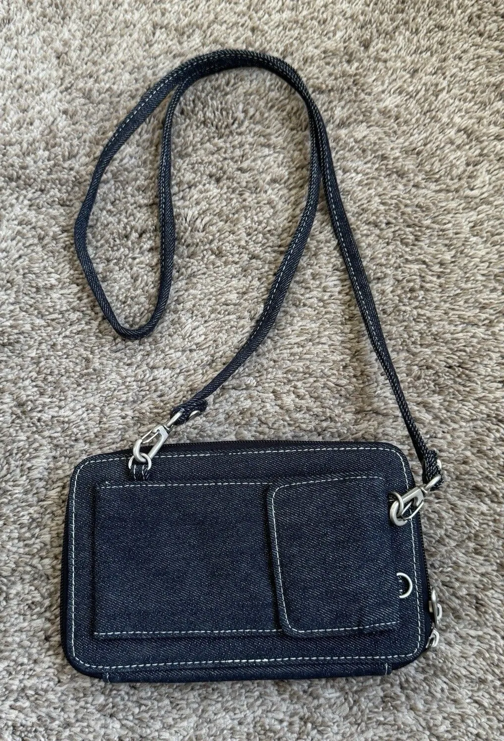 This Denim Crossbody Wallet Purse Clutch is a stylish and functional accessory for women on the go. With a compact size and denim exterior, it is perfect for travel, casual outings, or workwear. The wallet design includes convenient pockets for storing essentials, while the crossbody style offers hands-free convenience. The exterior color in denim blue adds a trendy touch to any outfit, making it a versatile and practical choice for busy women on the move. Y2K 90s Look Has pockets to hold a phone but one on the smaller side. 8 x 5 inches Preowned smoke free