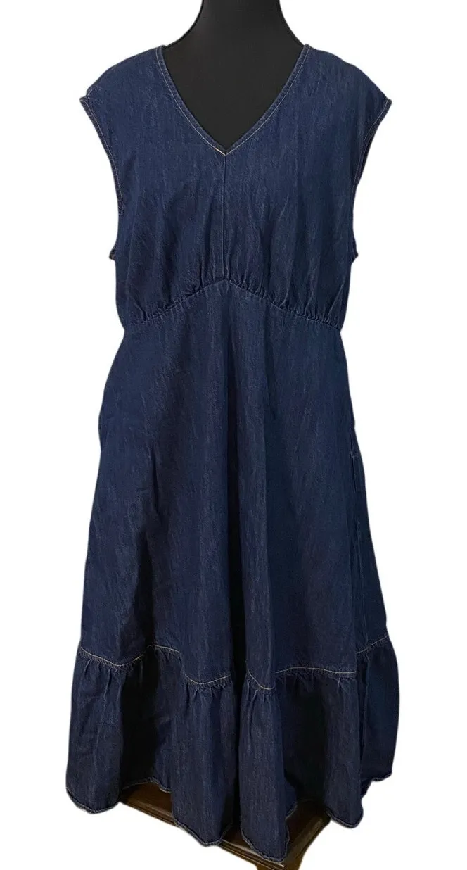Denim Midi Dress XL V-Neck Sleeveless Tiered Ruffle Skirt Pockets Description: Soft lightweight den... Show more
