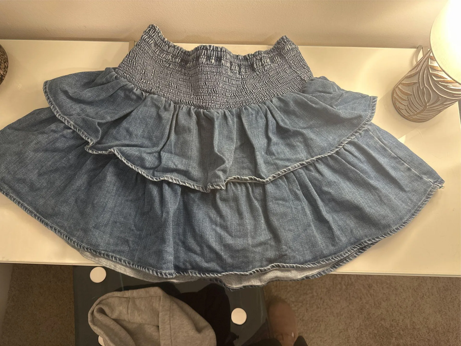 Only worn once! Super cute ruffle denim skirt has a stretchy waistband and is comfortable.