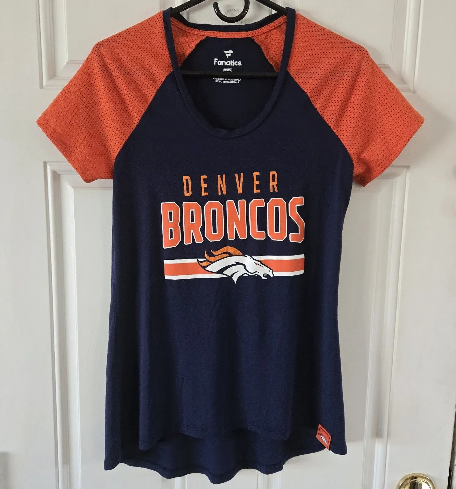 Denver Broncos Fanatics top features a navy body with orange mesh raglan sleeves for a sporty, breathable athleisure vibe. The tunic-length fit is longer in the back, making it flattering and easy to wear with leggings or jeans on game day. Official NFL fan gear with bold Broncos graphics on the front. Size womens medium. Measurements: pit to pit 16.5, front length 26.5, back length 29.5. Aesthetic tags: sporty, athleisure, NFL fan gear, casual, game day, team wear