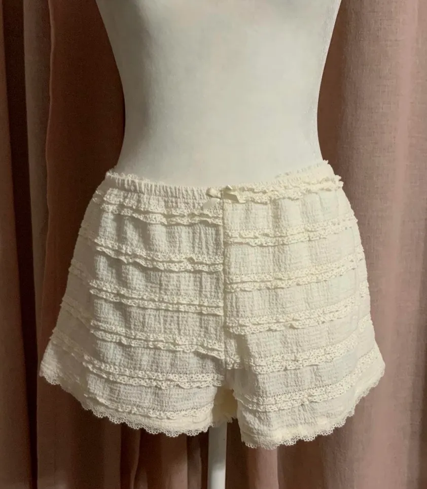 cream lace ruffle shorts bloomers with bow detail ,elastic waistband, slightly see through, very str... Show more