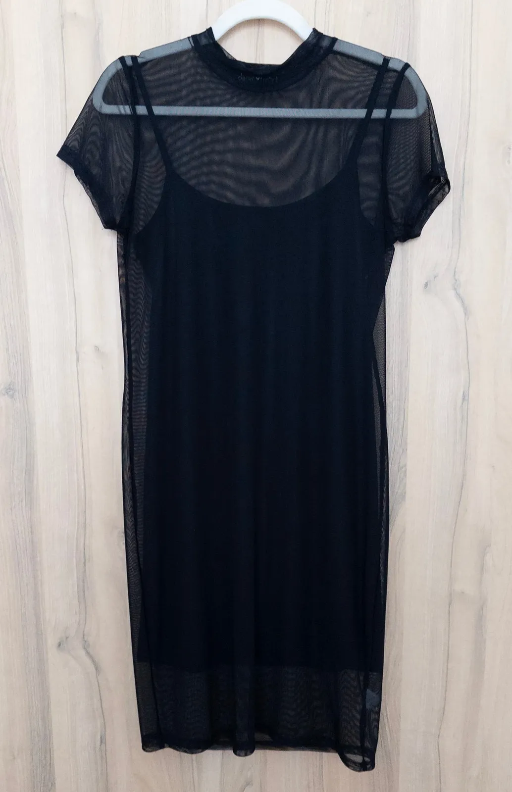 Features: * Fully sheer mesh overlay (see-through) * Short sleeves with mock neck detail * Slip-styl... Show more