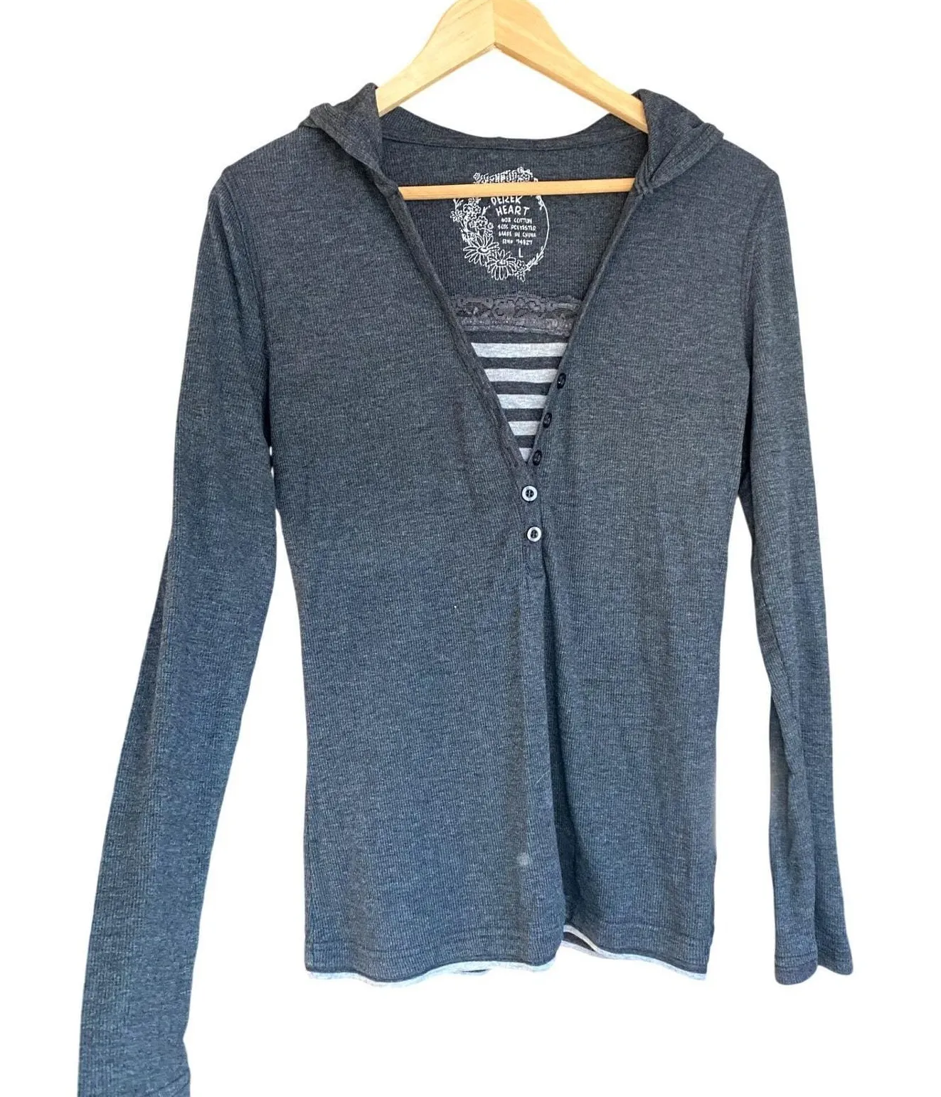 sk8ter, 2000's, paris hilton, bella swan, elena gilbert, Derek Heart, hooded, henley, long sleeve, charcoal, gray, ribbed knit, striped inset, lace trim, casual, layering, comfortable, women's apparel, hollister