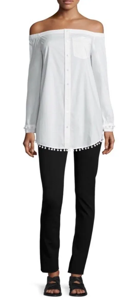 Derek lam 10 Crosby poplin shirtdress in cotton Off the shoulder neckline Button down front Long sleeves Patch pocket on the left Shirt silhouette Shirttail hem with pom-pom detail In excellent used condition EUC Fits true to size Cut for a relaxed fit Non-stretch fabric 100% cotton Approx length 27” from shoulder to hem, 27” from center of back to hem Excellent used condition appears to have been barely worn appears pristine condition no noted flaws practically new Freshly laundered Smoke free home Preppy upscale designer hamptons vacation beach cruise pool vacay beachy boho pom poms detail embellishment neutral minimal minimalism cute