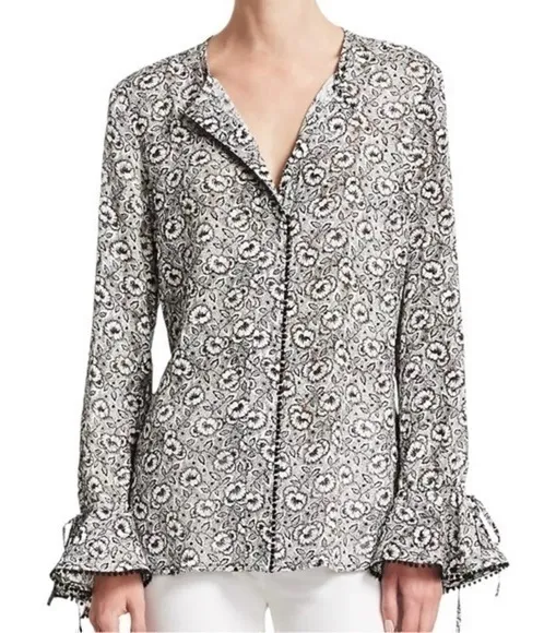 A delicate knotted pom-pom trim adds crafty appeal to this floral flare sleeve blouse. Split collar. Bell sleeves. Drawstring cuffs. Pullover style. Silk/viscose Approximate Measurement’s Taken Flat: Chest: 19” Length: 26” ▪️ Excellent used condition. ▪️ The pictures are an important part of the description, please check them out carefully before you buy. You'll get what you see in the pictures. ▪️ Colors shown on-screen can vary from computer to computer. I make every effort to photograph each item individually and list with accuracy. ▪️ Classic, timeless, travel, weekend, vacation, everyday, easy, versatile, iconic, resort, sporty, laidback, effortless, throw on and go, comfortable, casual, work, business, office, wear, event, special occasion, social, show, gathering, rehearsal, basic, essential, staple. Thank you XOXO - Ro