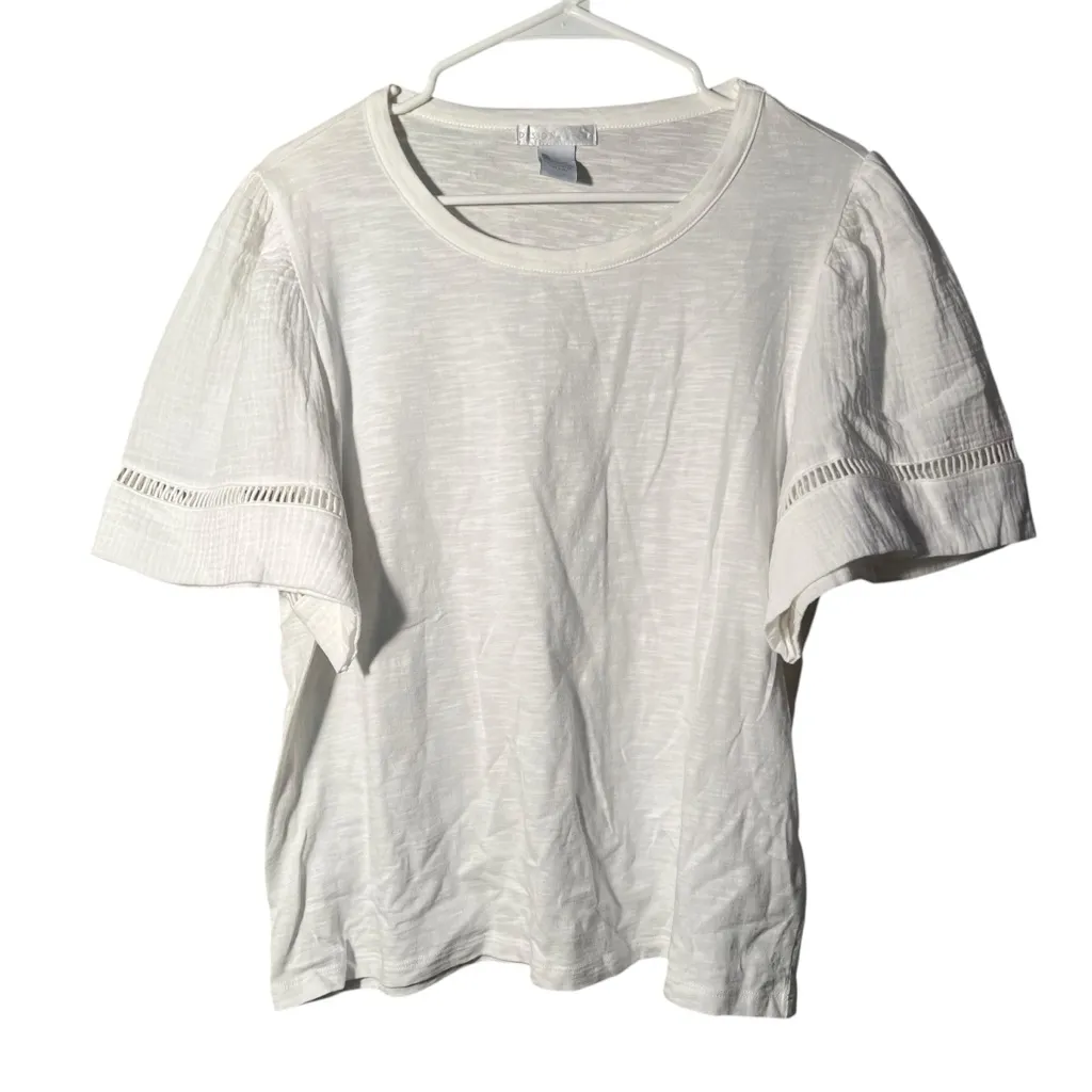 Great condition. Design History. Gauzy t-shirt. White. Round neck. Short, wide sleeves with crochet details. Size XL. 100% cotton. Pit to pit laying flat 18.5” Shoulder to hem 24” Sleeve (shoulder to hem) 11”. All measurements are approximate and taken lying flat. Smoke free home. No trades, offers welcome.