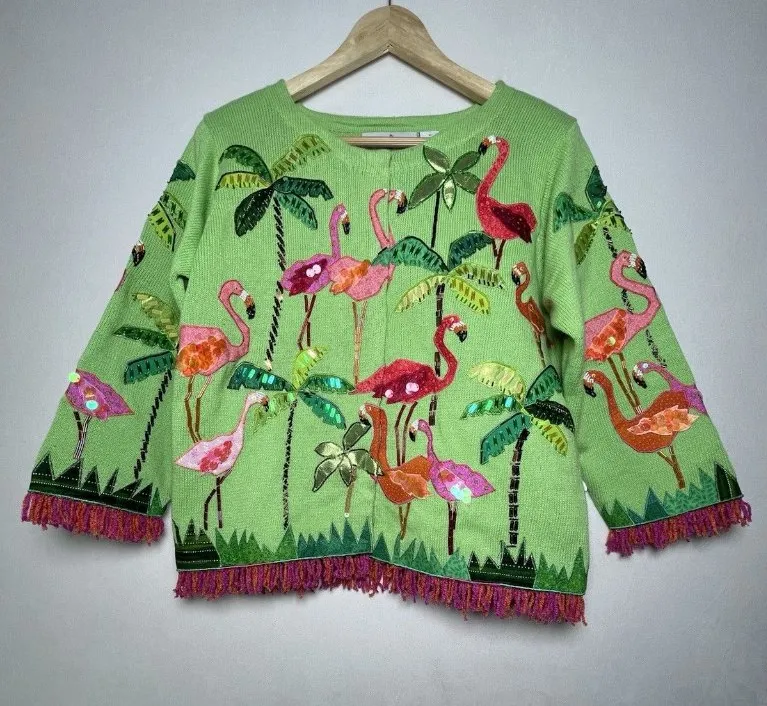 Design Options Vtg Phillip & Jane Gordon Green Flamingo Sequin Cardigan Wmn Sz M Size M - $60 New With Tags - From heather