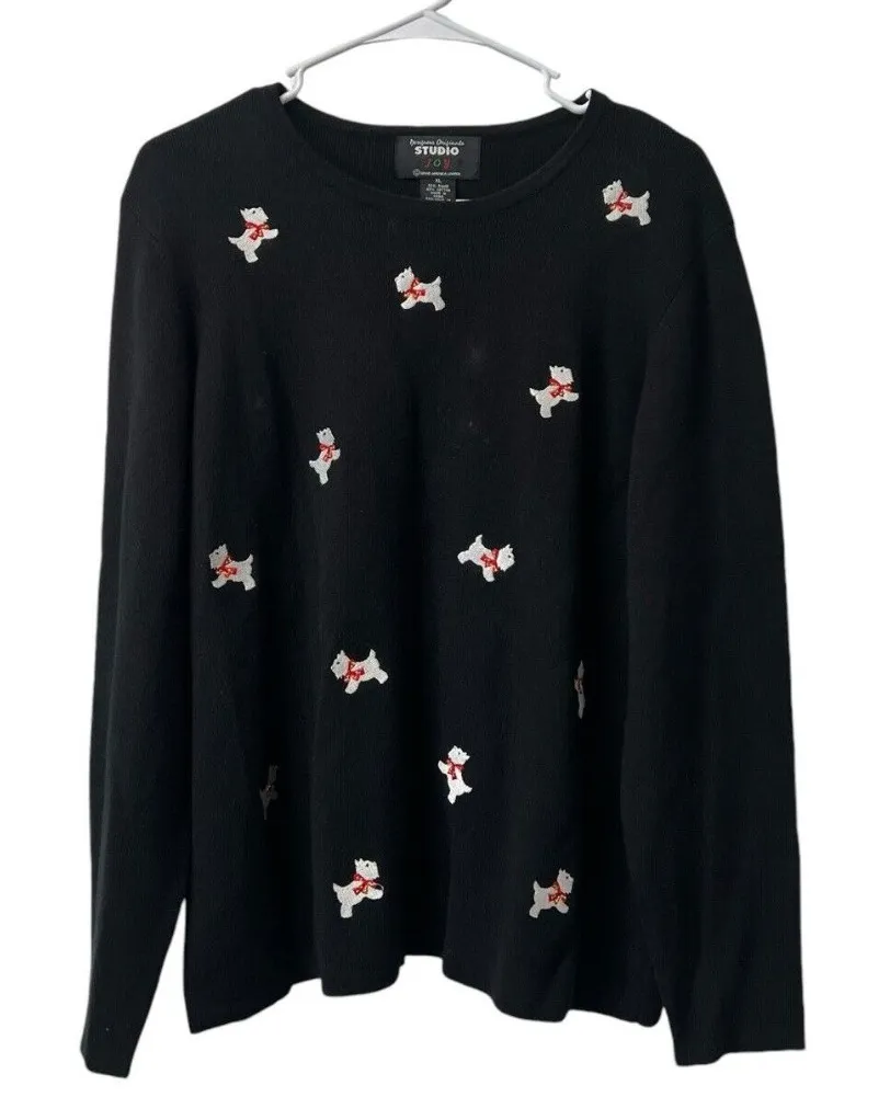 This sweater is preowned and in great used condtion! Designers Originals Studio Joy Women Sweater Dog Christmas Size XL Holiday ***Please be advised, color may appear more vibrant, lighter/darker in pictures due to flash, contrast, lighting or your phone/computer screen set up, etc. I try to described color as best as possible. I do check every item very closely while taking pictures and while packing it for shipping but it is very easy to still miss a stain or small damage. So please, if you receive an item with a defect not mentioned on the description, message me and I will do my best to fix the problem. Thank you! This item is pre-owned. Any questions please dont hesitate to ask.