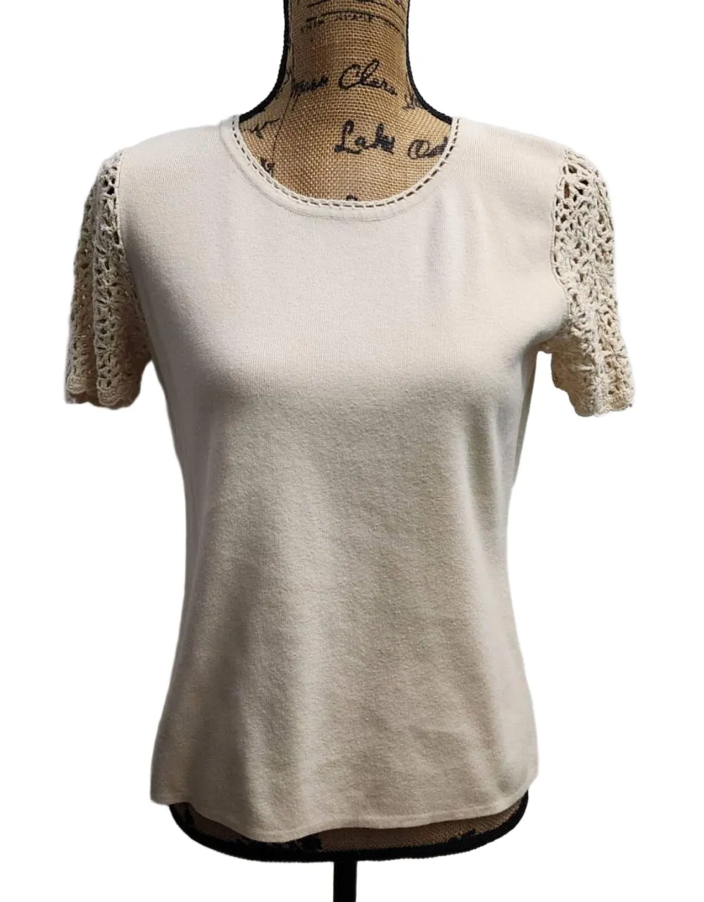 Designers Originals Top Womens Size Large Beige Short Sleeve Crochet Sleeves Boho Chic Condition: Good condition. Size: Large Material: 80% Algodón, 20% Nilón Features: Crochet Sleeves, Round Neck, Beige Color, Short Sleeve Measurements: See pictures. Tags: casualwear, summer, everyday, travel, breathable, feminine, relaxed, layering, weekend, modern, versatile, minimal