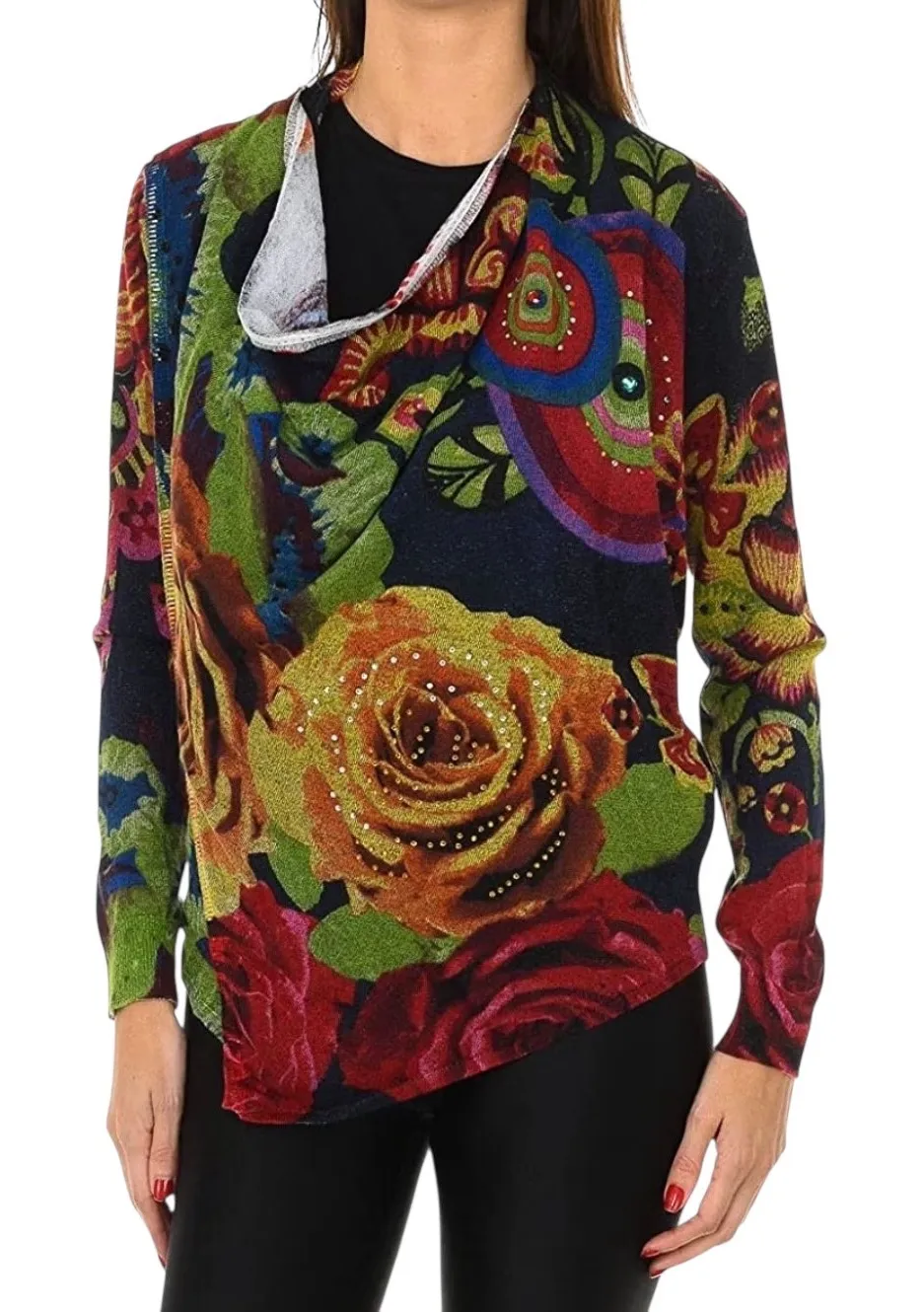 Desigual Beni Cardigan Sweater Womens Size M Multicolor Floral Asymmetrical Boho Artsy New without tags Asymmetrical front Long sleeves Cowl neck Zipper detail on shoulder Floral print Knit fabric 39% Cotton, 32% Viscose, 15% Polyester, 9% Metallic fiber Hand wash cold pit to pit 19.25" length 27" lightweight, art to wear, draped, euro, party, festive, holiday, night out
