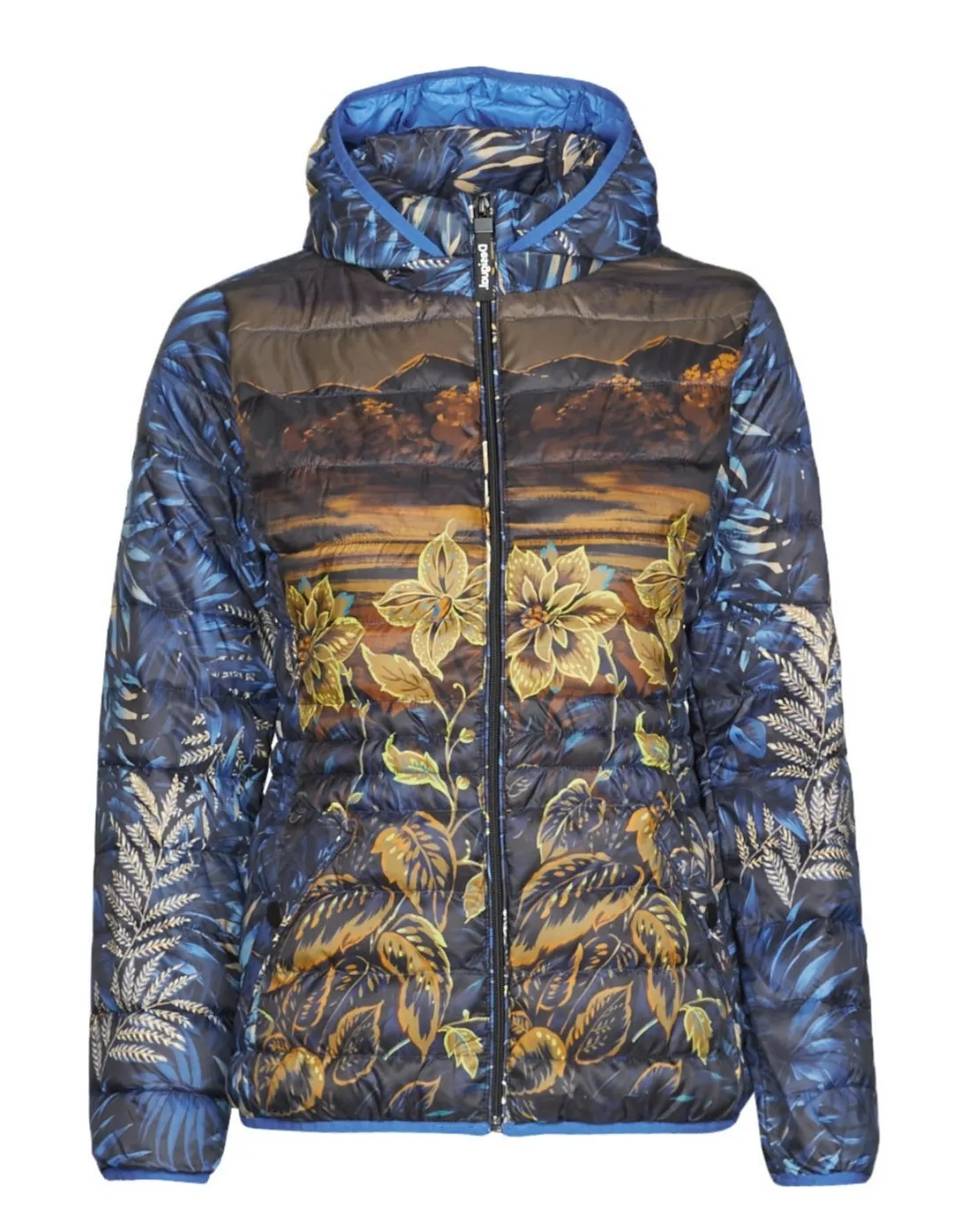 Desigual Women's Puffer Floral Padded_Ankor High Neck Jacket with Detachable Hood - US Size M - New with Tags MSRP $159.95 New with tags US Size M (Medium) / Euro Size L (Large) - see approx measurements in photos 9 & 10 to ascertain proper fit Dark blue color with lighter blue, tan, brown and orange flowers, light blue interior lining, blue elastic trim on the cuffs and hem - if the exact color is very important to you, please reach out before purchasing and I will take some photos for you outdoors during daylight Features: - floral print - high neck - detachable hood - zip closure - cinch cords at the waist - snap closure handwarmer pockets - zip closure pocket inside for valuables - packable into included pouch, great for space saving travel needs 100% polyester Style 20WWEW01-5001 Wash inside out Desigual is a Spanish (Barcelona) designer brand sold at Revolve Feel free to bundle with other Desigual items I have listed and save! Non-smoking household Fast shipping