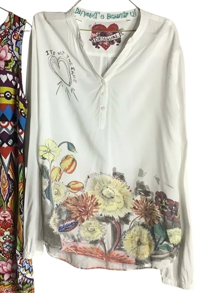 One for you and 1 for a friend. Italian designer wear art dress and a tunic. Both wear to your next party. Pop art designs! This beautiful Desigual Brigitte dress bundle is a must-have for any fashion-forward woman. The dress and tunic top both feature a stunning floral pattern and come in sizes medium and extra large. The neckline of the dress is both round and V-shaped, making it versatile for any occasion. You can wear this dress and tunic top to a party or cocktail event, as well as for casual outings or while traveling. They are machine washable, ensuring easy care and maintenance. The white color and sleeveless/long sleeve options add to their appeal. This Desigual dress bundle is perfect for the summer, fall, and spring seasons.