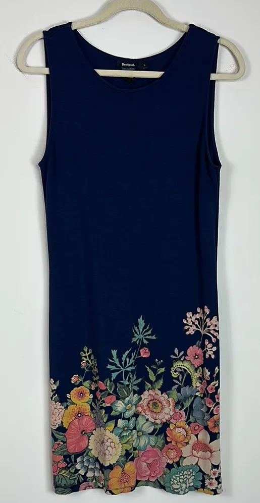 In excellent condition, no flaws. Current style. Navy color at top is called marine. Floral Design all along bottom edge at back and front. High neckline. Very sturdy and stretchy material composition. Above the knee fit. Straight and relaxed fit. Size: Large Color: Marine (navy) Laying Flat Chest: 19” Length: 38” SKU: 306/9