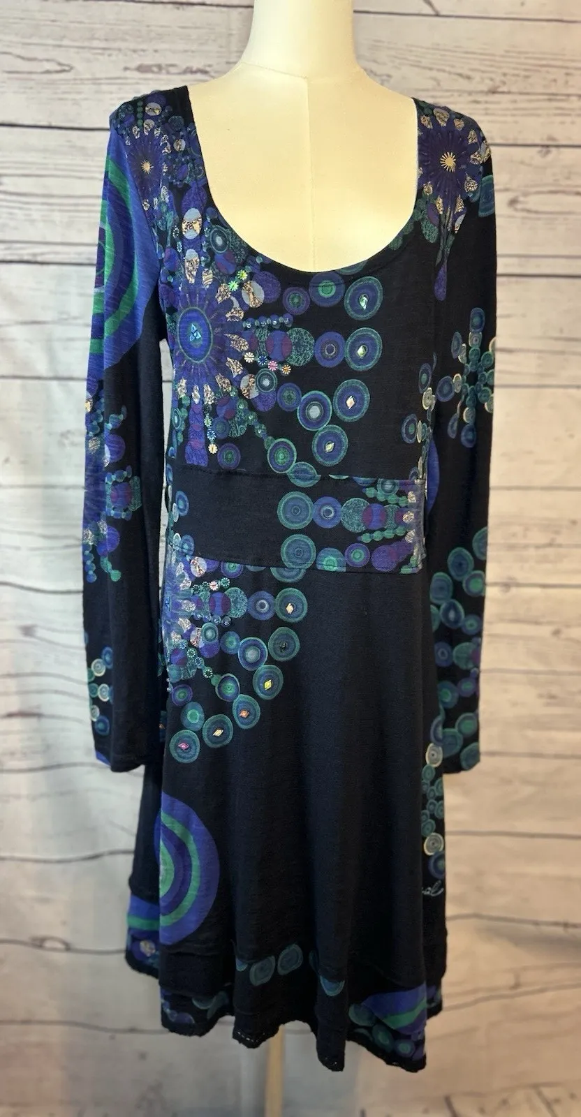 Eye-catching and artsy Desigual dress featuring long sleeves, a scoop neckline, and vibrant abstract circular prints in shades of blue and green. Embellished with beaded accents that add a playful sparkle to the design. Made from soft, flowy fabric with a flattering silhouette. Note: missing original waist strap and has a minor flaw on one shoulder (see photo for detail). Still in good used condition. Approximately: Pit to pit 19 Sleeve 20.5 Length 40 Desigual dress, abstract print dress, blue green dress, beaded dress, boho chic, artistic dress, XL Desigual, long sleeve dress, missing waist tie, Desigual embellishments, scoop neck, bohemian style dress, pre-owned Desigual