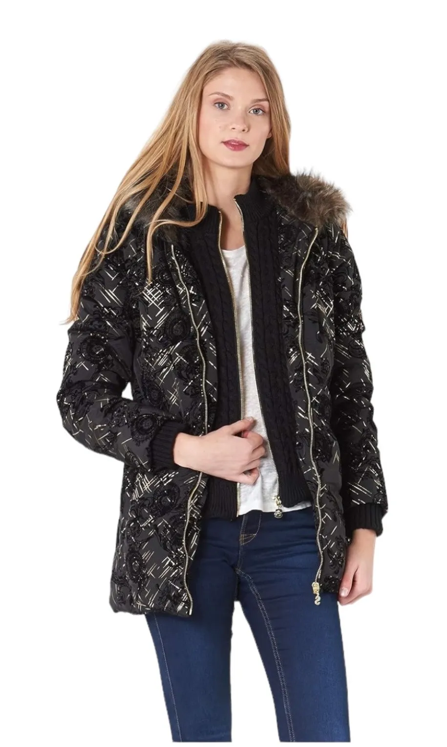 Zip front parka with a sweater inset for a layered look Attached hood with faux fur Lined Rib cuffed sleeves Black with black and gold design New with tags Armpit to armpit 19" Length 29"