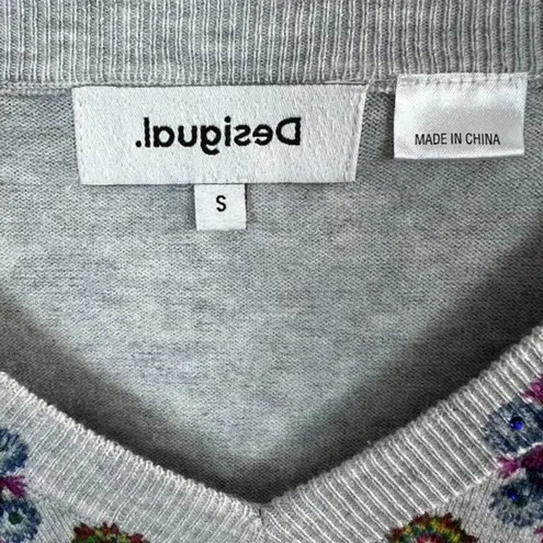 Very good condition! No rips, tears, holes or stains. Pullover Solid gray with multicolor floral medallion pattern on front and back Minimal small rhinestone jewel accents add a little sparkle Long sleeve Lightweight knit Relaxed fit Cotton, modal, polyamide - machine wash Underarm to underarm: 21.5 in Length (shoulder to hem): 23 in