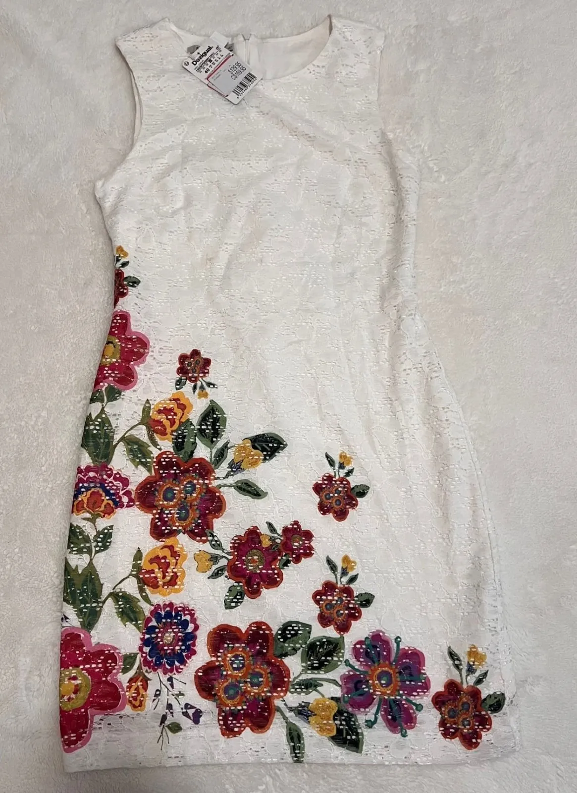 Desigual Vest Karlin sheath dress, a striking white lace design adorned with vibrant floral embellishments. This sleeveless dress features a flattering sheath silhouette, perfect for showcasing a feminine and artistic style. Ideal for garden parties, summer weddings, or a stylish brunch. Measurements: • Shoulder to Shoulder: 13.5 in • Pit to Pit: 16 in • Length: 35 in Style: Sheath, Shift Dress Length: Knee Length Department: Women Sleeve Length: Sleeveless Pattern: Floral Occasion: Casual, Party/Cocktail Fabric Type: Lace Theme: Flower Neckline: Round Neck Season: Spring, Summer Unit Type: Unit HAS A SMALL STAIN ON FRONT OF DRESS Keywords: Desigual, lace dress, floral dress, embellished dress, sheath dress, summer dress, party dress, wedding guest, feminine, artistic, European size 40, US size 6, garden party, brunch outfit Ships 1-3 business days after purchase Comes from a pet free/ smoke free environment SKU:0031