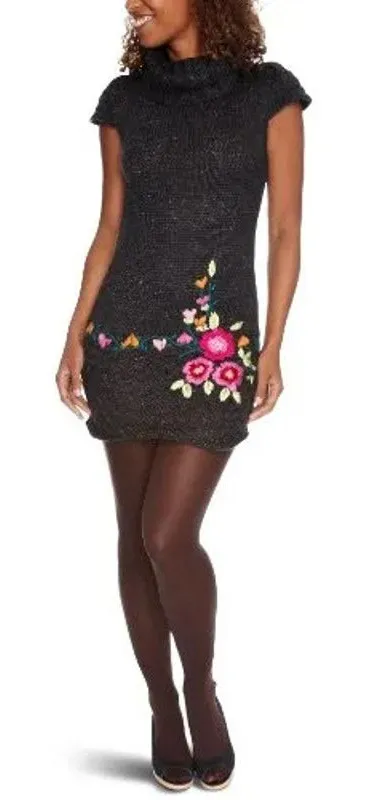 Desigual Womens Dress Sz XL Gray Embroidered Flowers Carey Sweater Cap Sleeve GENERALLY SHIP SAME OR NEXT DAY FROM FLORIDA!!! Please note that this item seems to run small. The short Carey dress by Desigual brings a variety to the wintry grey with its colorful flower embroidery. Even the main color of the yarn is more anthracite than black and mixed with colorful threads . The hem and short sleeves are knitted in a cross pattern and the cowl neckline is ribbed. The chunky knit wool-mohair blend is very soft and keeps you warm. Back is plain except for the Desigual logo in gold embroidery, Acrylic/Nylon/Wool/Mohair Gently worn and washed but please note fuzziness. Slightly rolled hem About 37" long About 17" underarm to underarm