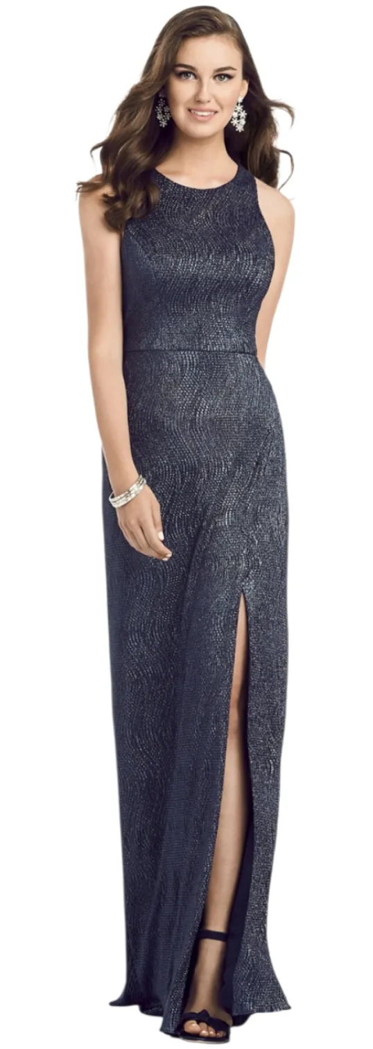 Dessy Collection Evening Gown Women's 6 Blue Metallic Sleeveless Maxi Dress Wedding Guest, cocktail party, holiday, formal, special occasions, events, mother of bride, mother of groom, bridesmaid, maid of honor, prom, pageant New without tags. Never worn. Blue/Silver Metallic fabric. Color name: Midnight Thigh high front slit. Keyhole back. Center back zip closure. Lined. Bust pit to pit 16". Waist is 13.5" across laying flat. Length is approximately 62". Hr 010826 122424