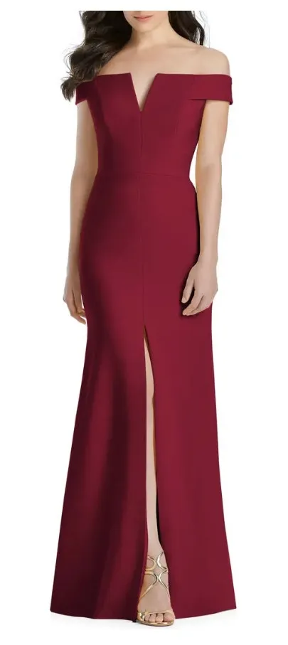Notched Off the Shoulder Crepe Gown color burgundy h8 A crepe gown is designed with a notched off-the-shoulder neckline and a fitted trumpet silhouette for a simply elegant and classically alluring evening look Off-the-shoulder neck Short sleeves Full-length trumpet skirt with front thigh-high slit no flaws