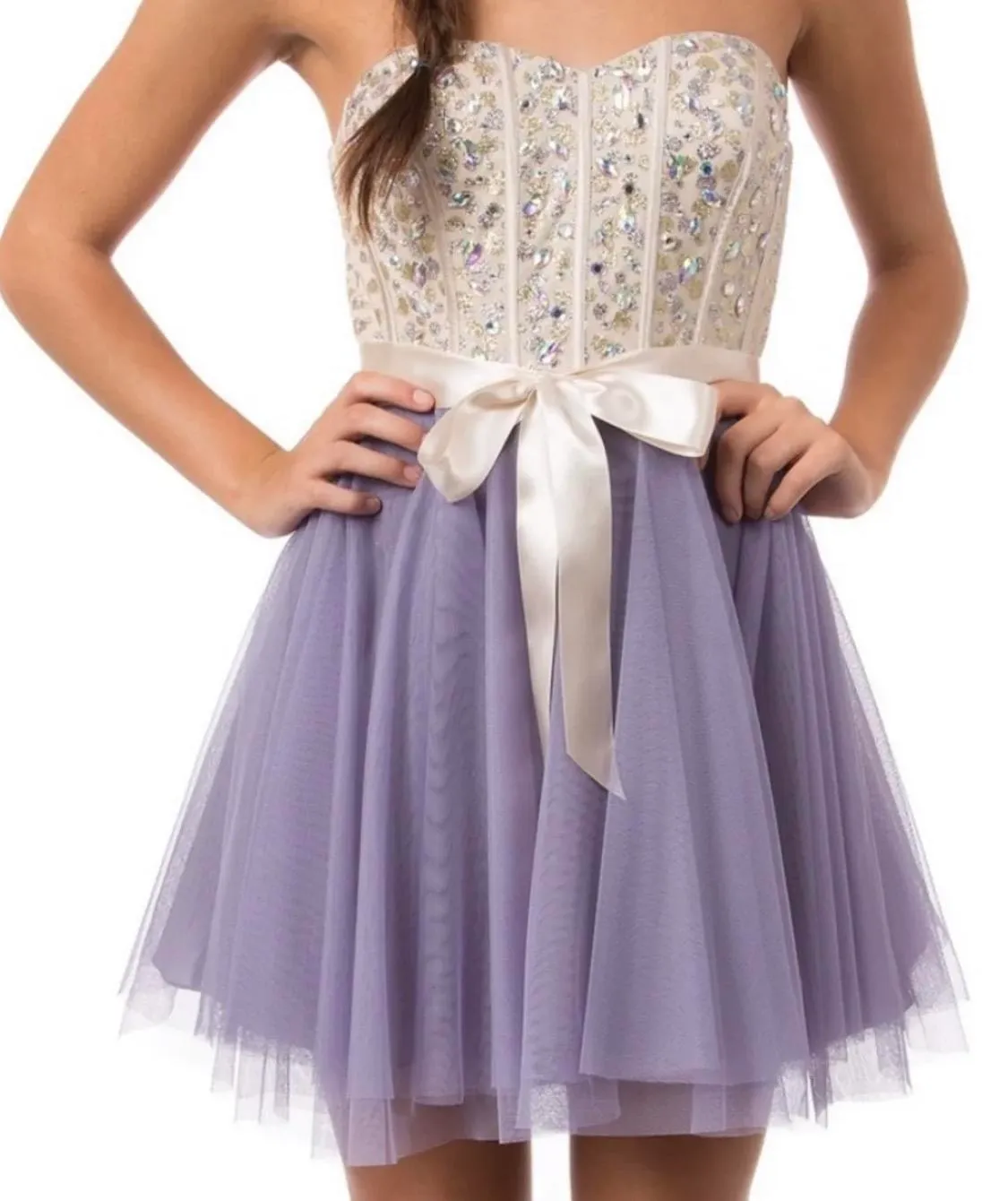 Violet/champagne color Size 5 Formal dress for formal event, homecoming, and prom event Short length (a little above the knee) Strapless and sleeveless Multiple layers of tool on bottom Top is sparkly and has sewn on beaded jewels Zipper in back Only worn once No rips, stains, or missing jewels Comes with sash to tie bow around waist Same condition as I bought it