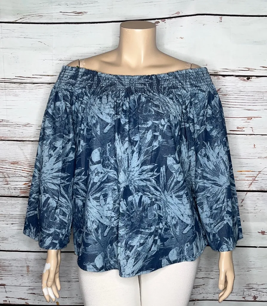 DG2 by Diane Gilman Size 2X Blue Floral Chambray Off the Shoulder Top. Smock Elastic Neckline. Bell, 3/4 Sleeves. Cotton/Lyocell Blend. NWT, Brand New with Tags. Length is 26” & Bust is 26.5”. Measurements taken while garment is laying flat.