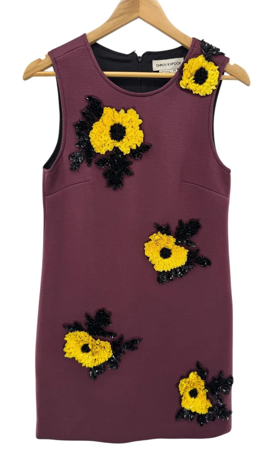 A charming burgundy sleeveless mini dress by Dhruv Kapoor adorned with vibrant yellow floral appliques and intricate black beadwork. This piece offers a unique blend of playful embellishment and a sophisticated silhouette, perfect for making a statement. Its tailored cut and eye-catching details ensure it stands out at any event, from a stylish brunch to an evening cocktail party. Style: Shift, Sheath Dress Length: Mini Department: Women Sleeve Length: Sleeveless Pattern: Floral Occasion: Party/Cocktail, Casual Material: Viscose, Polyester, PU Neckline: Round Neck Keywords: Dhruv Kapoor, mini dress, floral applique, beaded dress, embellished dress, sleeveless dress, burgundy dress, designer dress, evening dress, cocktail dress, statement dress, unique embellishment, party dress, fashion dress