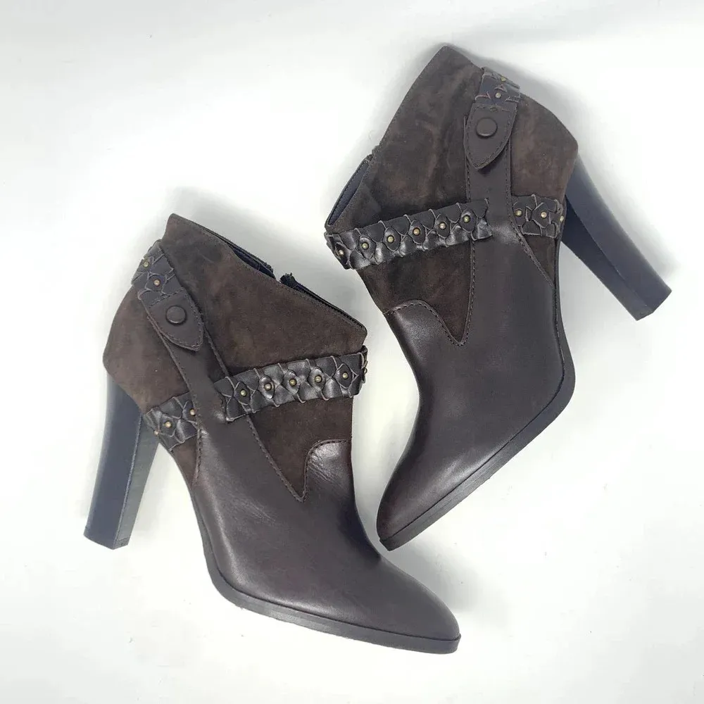 Diane Von Furstenberg Brown Suede Braided Booties. Leather and brown suede detail Gold studs on bra... Show more