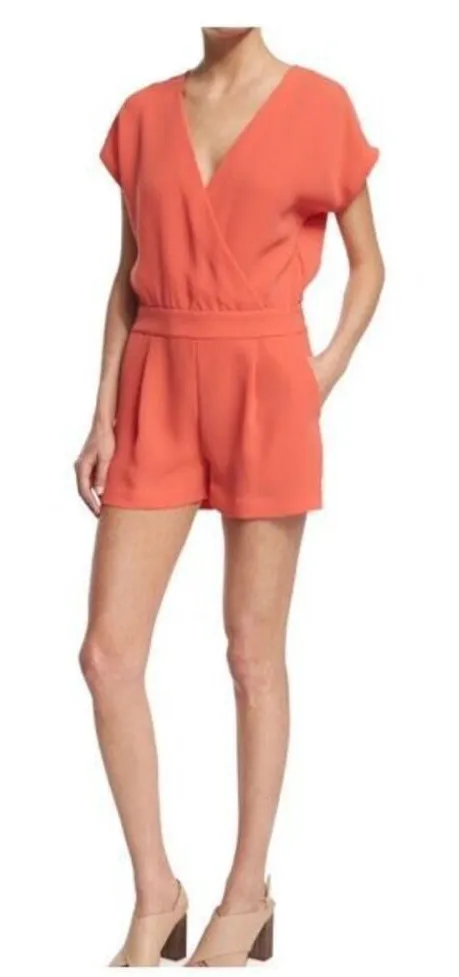 Diane von Furstenberg Emerson Crepe Surplice Romper, Ocean Coral Size 6 Coral colored romper Short... Show more