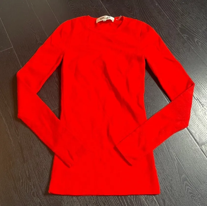 A vibrant red long-sleeved knit top from Diane von Furstenberg. This stylish piece features an intri... Show more