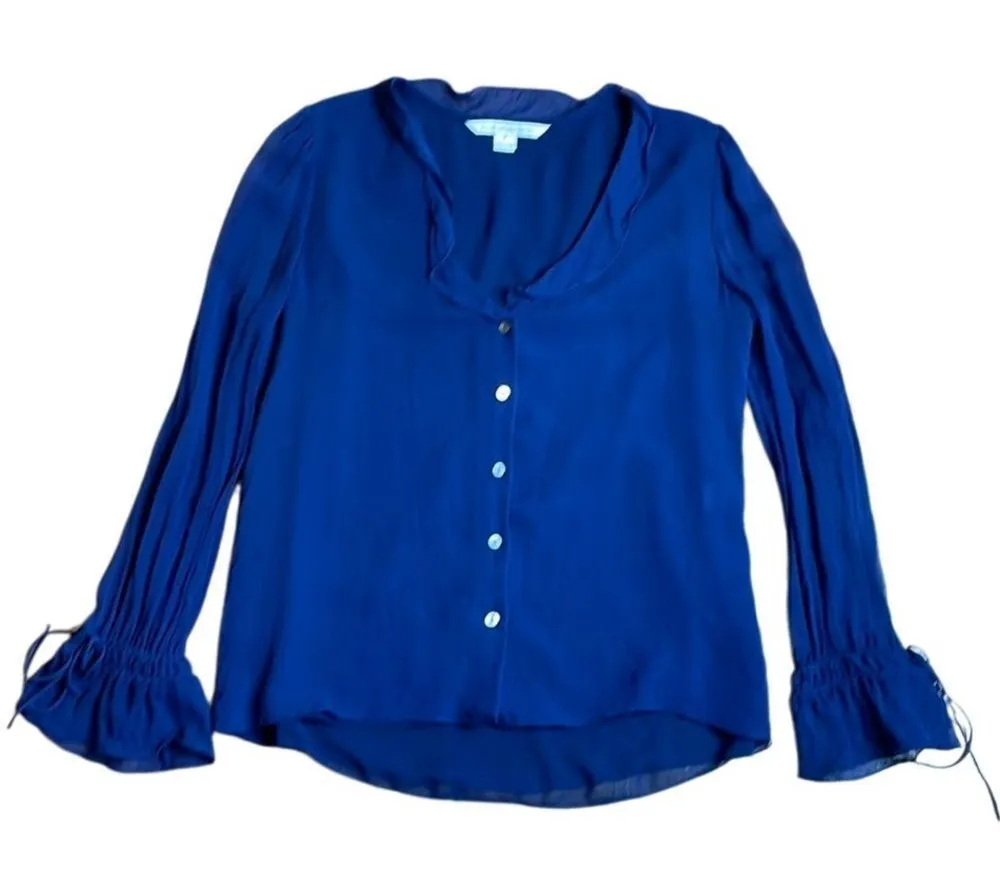 Diane Von Furstenburg Blue Sheer Silk Button Down Blouse size 8 Euc Ruffled collar and ruffled cin... Show more