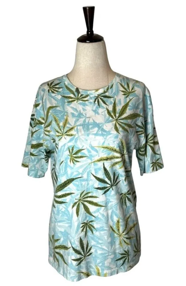 The Diane Von Furtstenberg shirt from the Huge Blue Cannabis Collection is a stylish blue crew neck tee with short sleeves and a floral pattern, perfect for casual wear.