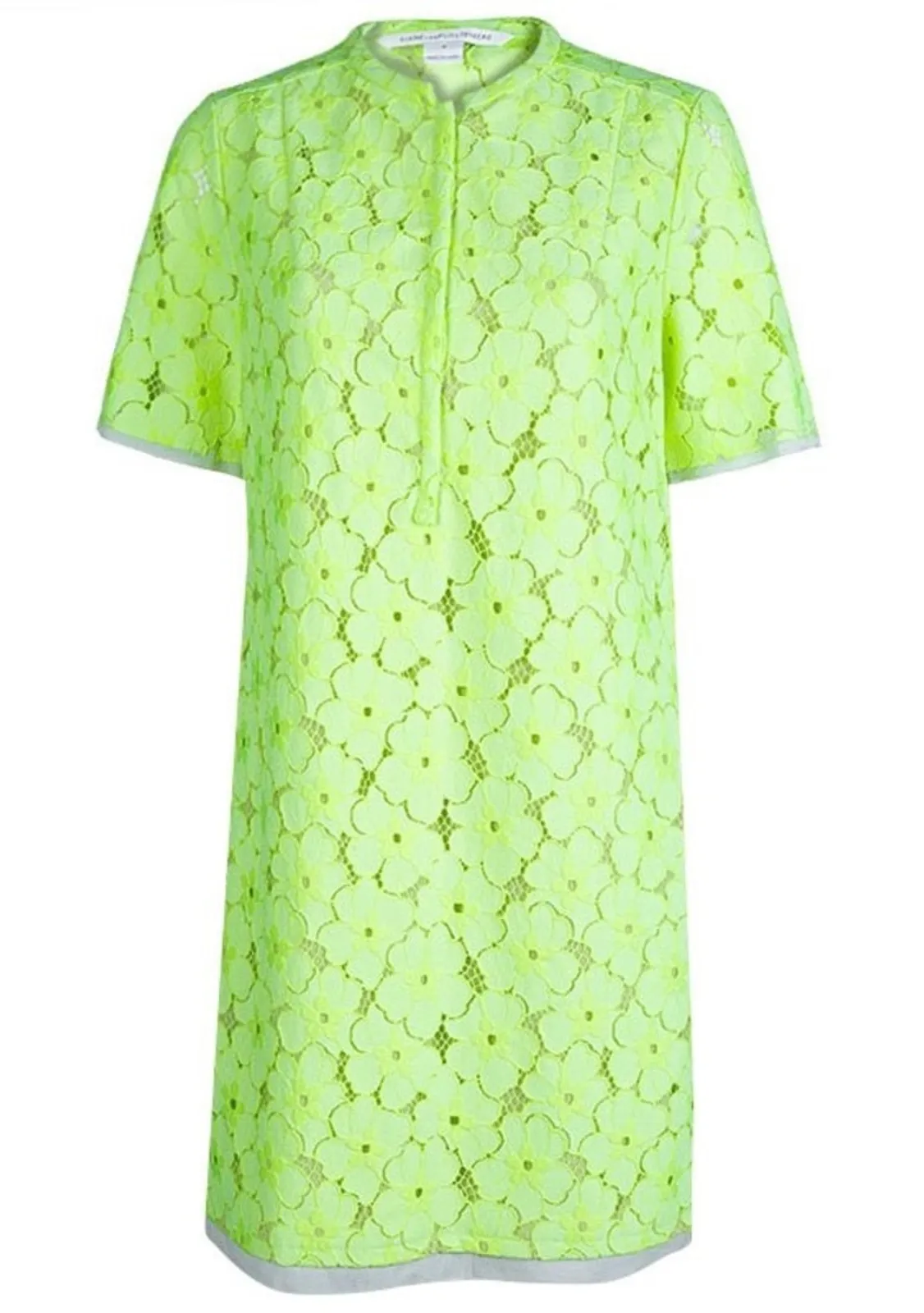 While the neon green color adds fun and playfulness to the dress, the pretty floral lace helps achieve a feminine look. Sheer trim along hemline and short sleeves with mock neckline and pockets on sides. Created in a comfortable shift dress with a retro style, it has a front button closure, concealed by a placket.