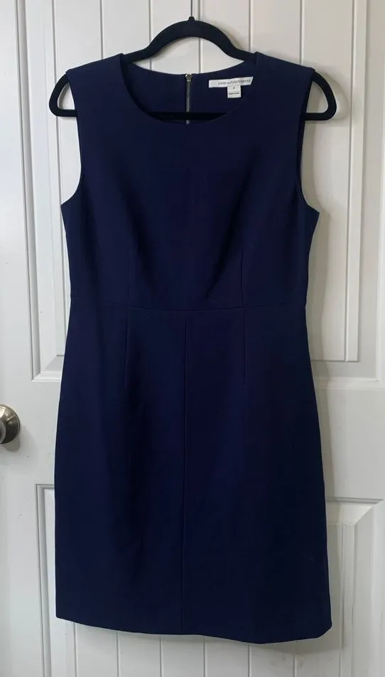 Keywords: Diane von Furstenberg, sheath dress, sleeveless dress, navy blue dress, work dress, career dress, business dress, cocktail dress, midi dress, women's dress, classic dress, fitted dress, size 8, professional dress, office dress