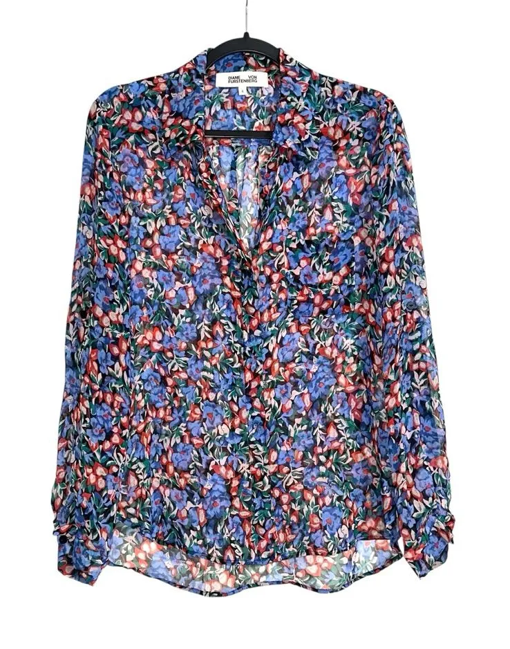 Chic floral blouse with vibrant blue and red hues. Lightweight and stylish for any occasion. NOTE:... Show more