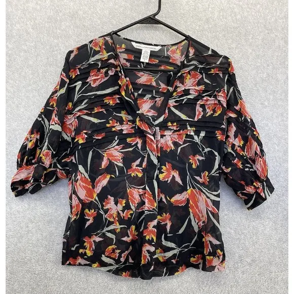 Diane Von Furstenberg Women's 100% Silk Blouse Short Sleeve Black Floral Size 6 Great Used Condition... Show more