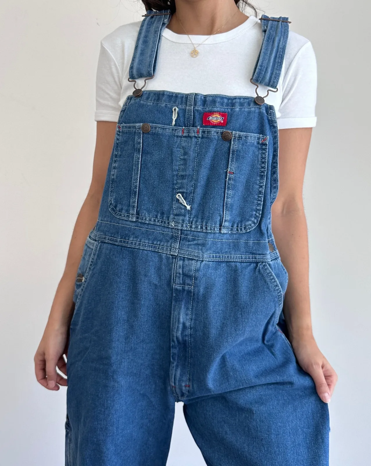 Unisex Pockets. Adjustable straps. Buttons on side. Wide straight Cropped leg. 100% cotton , non stretch rigid denim Brand: Dickies Great condition, no flaws ---------------------- Tagged as size 34 ( originally mens) , best fits a size L approx for women , depending on desired fit. Please compare all measurements to ensure fit. Measurements taken flat Waist 19'' Hip 24'' Inseam 30.5'' > For reference model is - 5.6'' - waist 26'' - hip 38'' - Slightly clipped on pictures, please compare measurements to determine fit. Farmcore cabincore cottagecore streetstyle Y2K vintage hip hip retro styles