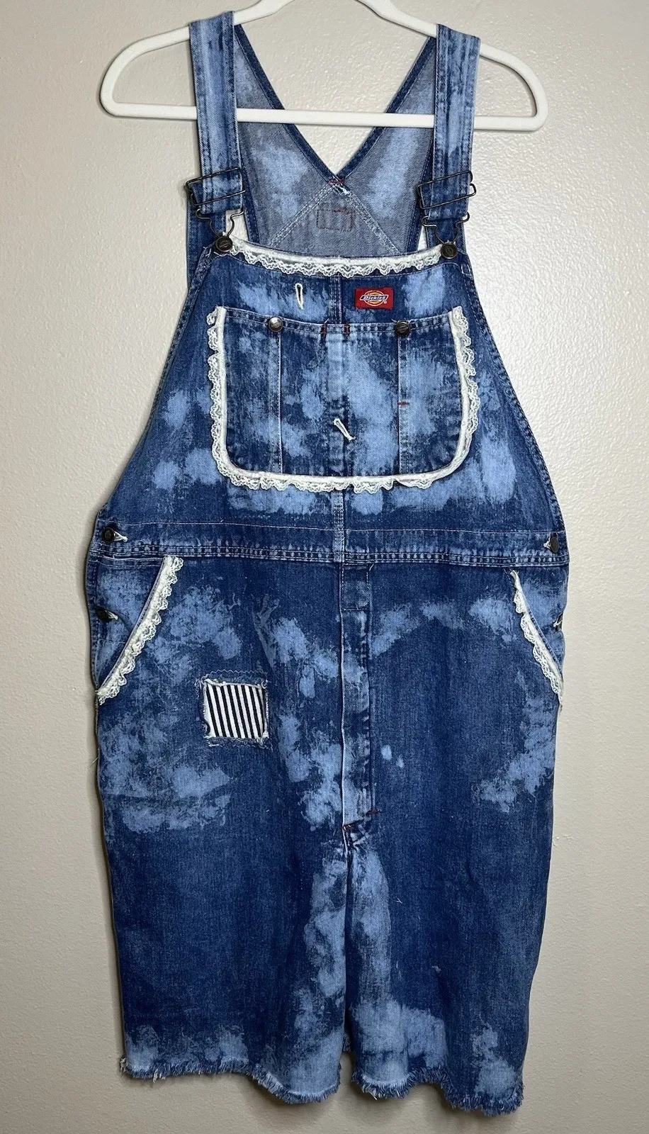This is a one of a kind piece- so so many fun details -lace details throughout piece -bleach tie dye/acid wash look -patchwork style -In good used condition, some slight wear on fabric (see all photos) no stains or holes, missing size tag Would fit a size XL/ XXL depending on how you would like the overalls to fit Measurements are taken on one side; Bib width on top: 11" Waist: 20" Hips: 23.5" Inseam10"